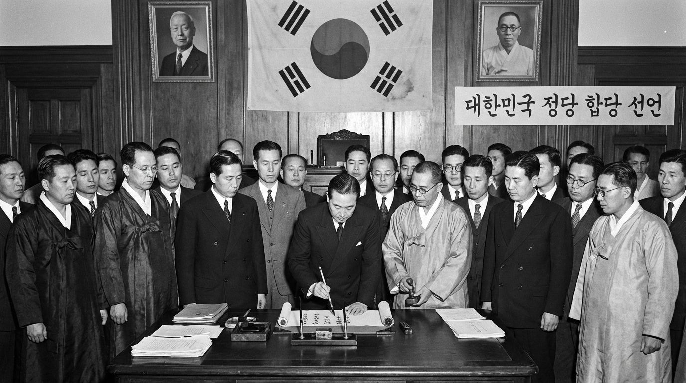 1949년 1월 26일에는 대한국민당과 한국민주당이 민주국민당으로 합당하기로 결의하고, 양측 지도부 공동명의의 성명서를 발표한 기록이 남아 있습니다. (db.history.go.kr)