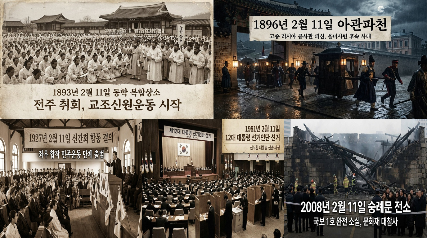 달력의 하루는 스쳐 지나가지만, 2월 11일 한국사에는 권력의 이동과 민중의 요구, 외세를 둘러싼 외교전, 좌우 연대의 실험, 권위주의적 제도 운영, 그리고 문화유산 보호의 경고가 한꺼번에 겹쳐 있습니다. 이 글은 서로 다른 시대의 사건 5건을 한 흐름으로 엮어, 왜 그 선택이 필요했고 무엇이 남았는지까지 정리합니다. 끝부분에는 추가로 확인할 사료 포인트도 제시합니다.
