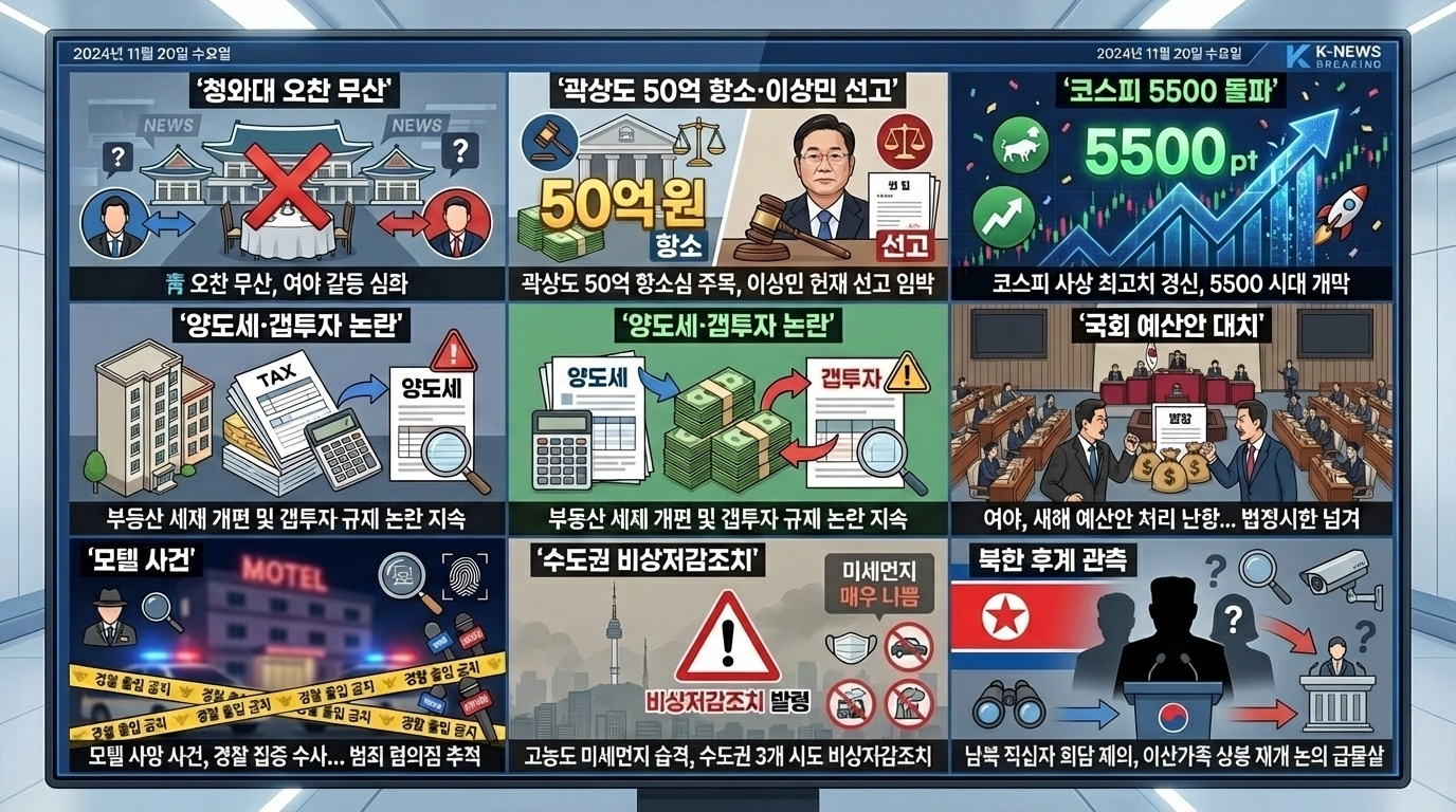 2월13일 뉴스 핵심 7가지를 24시간 흐름으로 정리합니다. 청와대 오찬 무산과 정국 파장, 곽상도 ‘50억’ 항소·이상민 선고, 코스피 5500 돌파, 양도세·갭투자 논란, 모텔 사건, 수도권 비상저감조치, 북한 후계 관측까지 오늘 꼭 알아둘 체크포인트로 확인하세요.