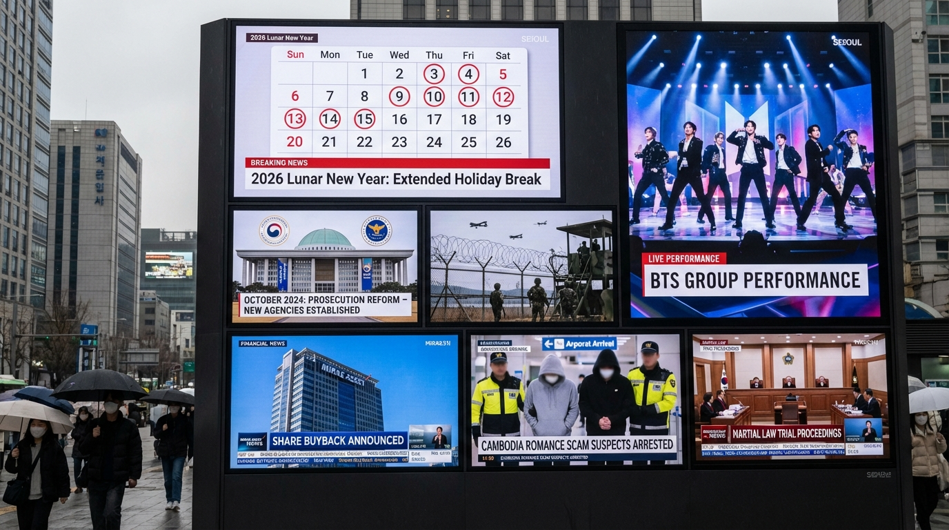 2026년 1월 27일 뉴스에서 임시공휴일로 길어진 설 연휴 일정, 10월 검찰청 폐지와 중수청·공소청 신설, 대북 무인기 논란의 확전 리스크, 미래에셋 자사주 매입, 캄보디아 로맨스스캠 송환, 계엄 재판 후폭풍, BTS 투어 이슈를 한눈에 정리합니다. 대응 팁도 포함합니다.