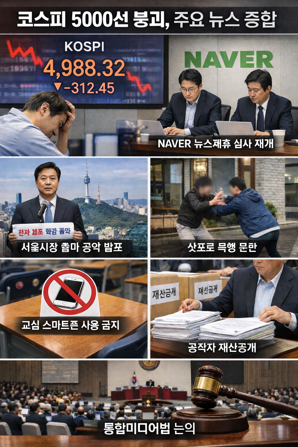 2026년 2월 3일 뉴스 핵심 7가지를 코스피 5000선 붕괴, 네이버 뉴스제휴 심사 재개, 서울시장 출마 공약, 삿포로 폭행 논란, 교실 스마트폰 사용 금지, 통합미디어법, 공직자 재산공개로 정리합니다. 작성 기준 2월 2일 0시~2월 3일 0시이며 확인 포인트를 담았습니다.