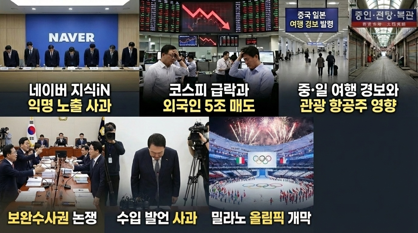 네이버 익명 노출 사과, 코스피 급락과 외국인 5조 매도, 중국 방일 경계가 한국 관광·항공주에 미치는 파장, 보완수사권 논쟁, ‘수입’ 발언 사과, 밀라노올림픽 개막