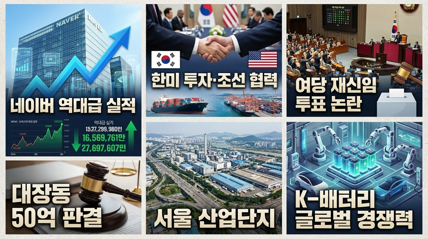 2026년 2월 7일 뉴스 흐름을 작성 시점 기준 24시간으로 압축했습니다. 네이버 역대급 실적, 한미 투자·조선 협력, 여당 대표 재신임 투표 논란, 대장동 50억 판결, 서울 공업지역 재편, 기부 릴레이와 소비 트렌드 변화, 해외 시각과 댓글 반응까지 한 번에 읽습니다.